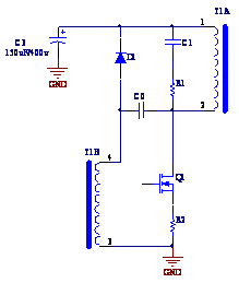 2.工作原理:1。當(dāng)Q1導(dǎo)通時,C3上的電壓通過T1A和Q1到地形成通路,此時,能量通過磁芯向次級傳送,同時,磁芯中的磁感應(yīng)強度呈線性增長。